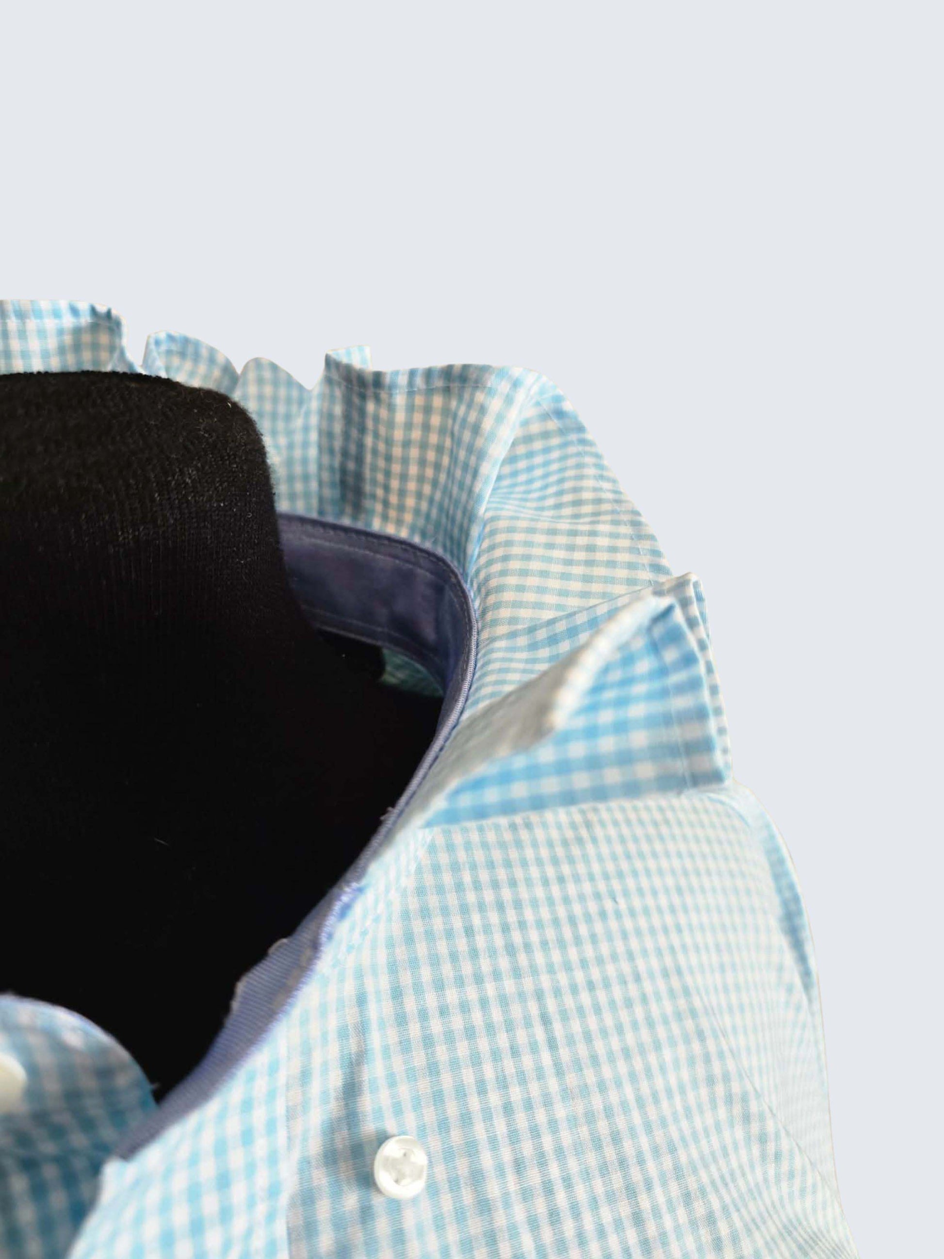 A classic men’s dress shirt, re-imagined with a feminine twist. This one-of-a-kind piece features a beautifully gathered ruffle neckline that adds softness and character to a structured silhouette. The original button-up design keeps it timeless and versatile, while the up-cycled nature gives it new life with purpose.